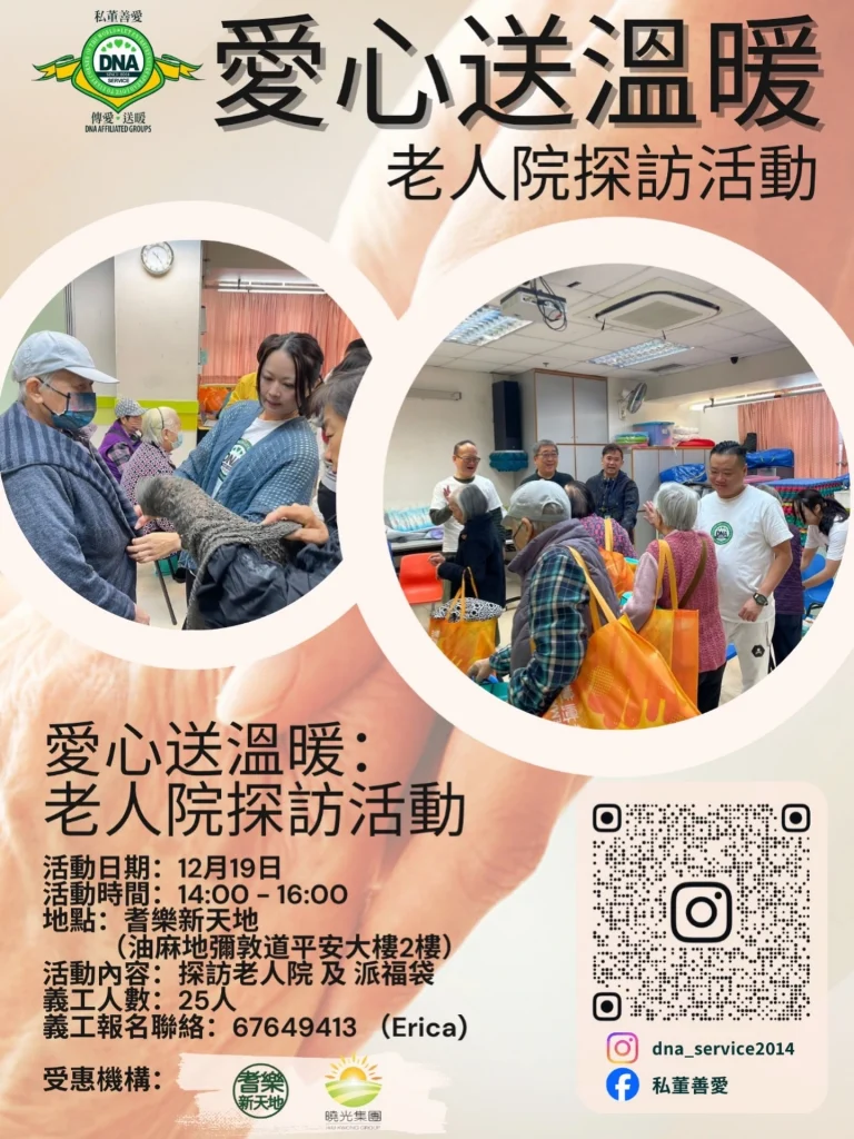 在這個寒意漸濃的冬季,一場充滿人情味的行動,為城市注入了最真實的溫暖。由 私董善愛 主辦的「寒冬送暖 · 愛伴耆樂」長者探訪活動,已於 12 月 19 日(星期五)在油麻地 耆樂新天地 圓滿結束。短短兩小時,卻為無數長者留下了難忘的笑容,也再次證明——陪伴,本身就是最珍貴的禮物。